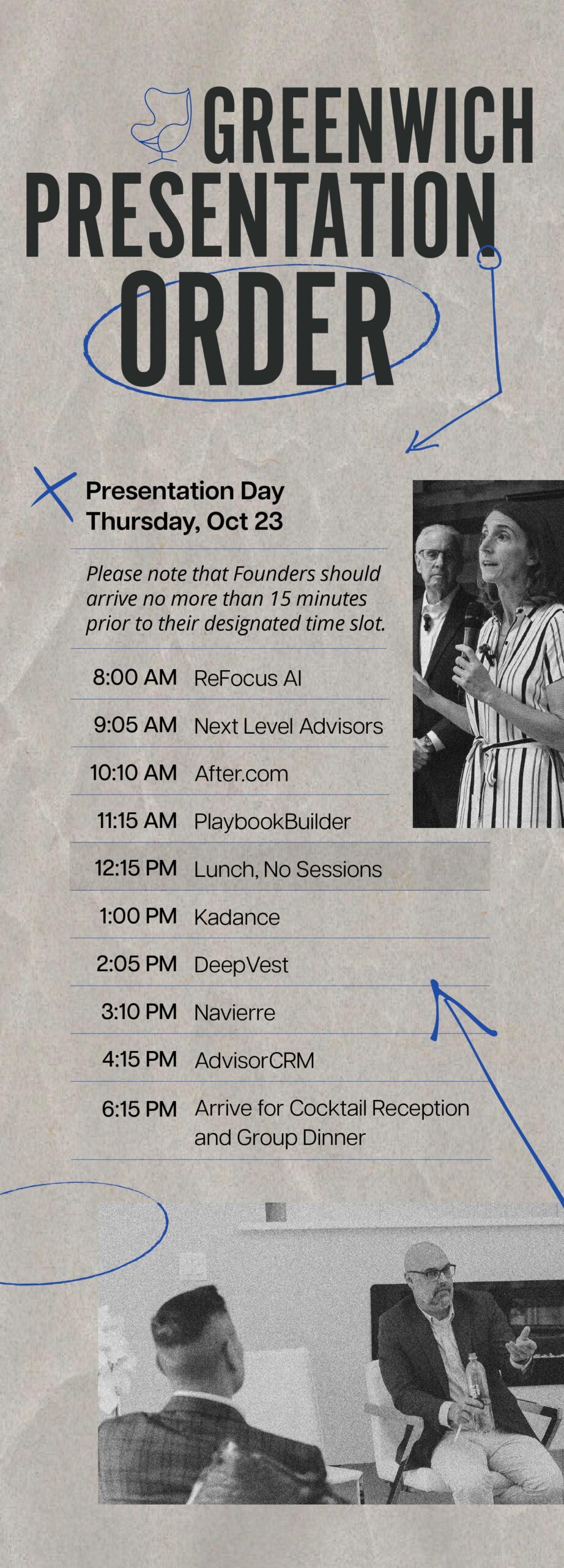 A curated gathering where founders and funders come together for authentic conversations, focused pitches, and meaningful connections. From private dinners to the main event, every moment is designed to spark partnerships, open doors, and fuel growth.